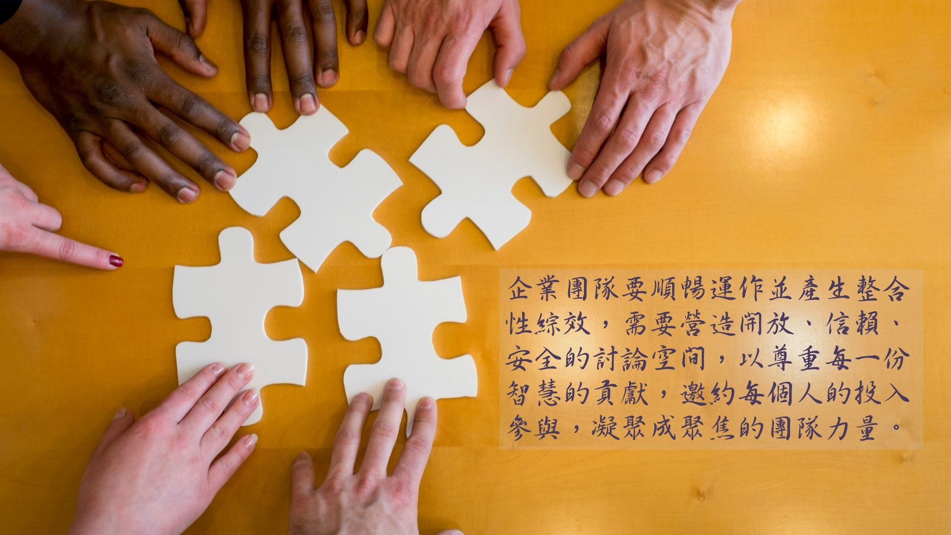 企業團隊要順暢運作並產生整合性綜效,需要營造開放、信賴、安全的討論空間,以尊重每一份智慧的貢獻,邀約每個人的投入參與,凝聚成聚焦的團隊力量。然而,在多元化與快速變化的時代中,現實的職場景況常常並非如此。